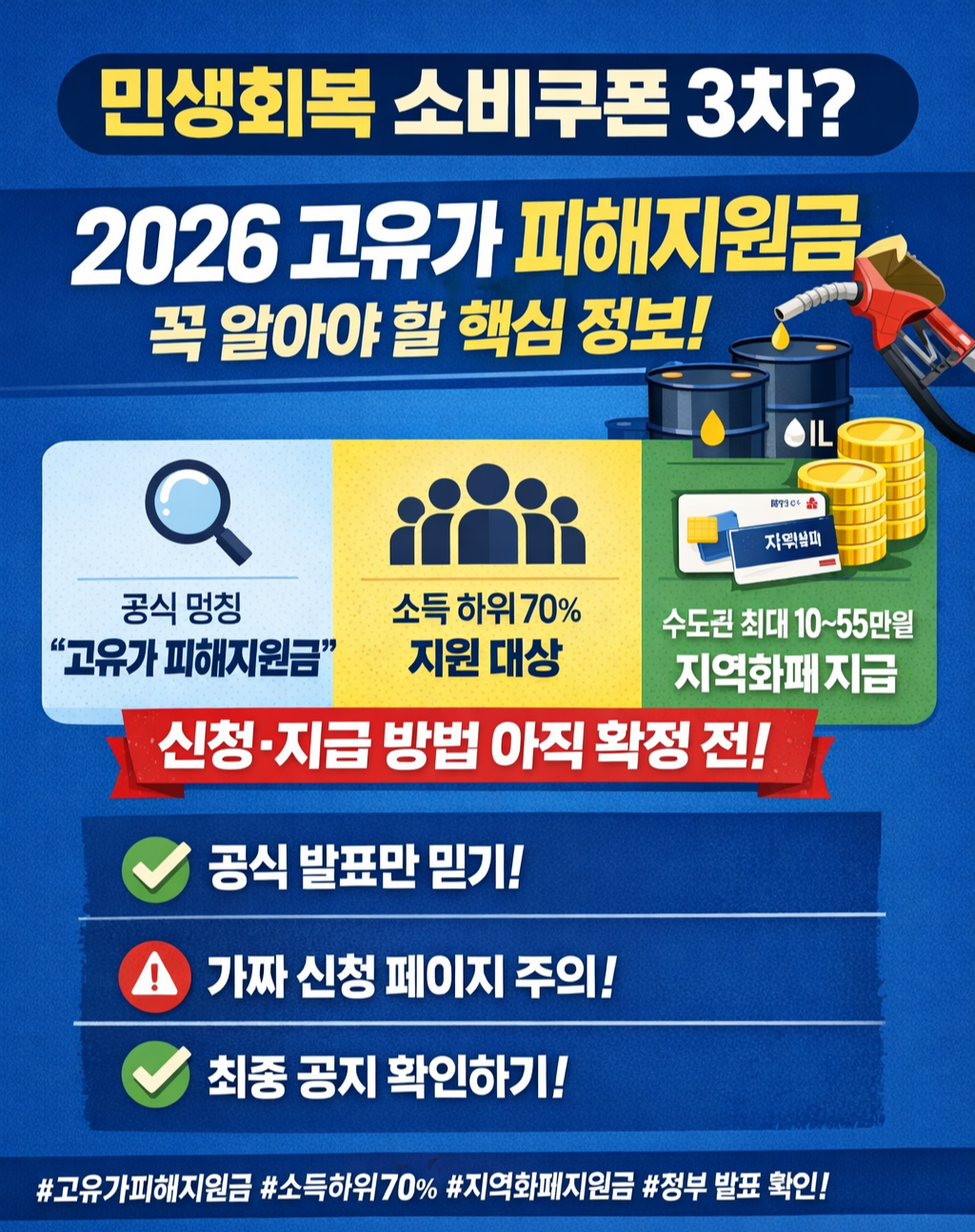 요즘 온라인에서 많이 보이는 민생지원금 3차라는 표현은 공식 사업명이 아닙니다. 정부가 발표한 공식 명칭은 고유가 피해지원금이며, 2026년 1차 추가경정예산안에 포함된 민생 지원책 중 하나입니다. 그래서 블로그나 커뮤니티에서는 민생지원금 3차라고 많이 부르더라도, 실제로 정부 발표를 확인할 때는 고유가 피해지원금이라는 이름으로 보는 것이 가장 정확합니다. 이 부분을 먼저 구분해야 가짜 신청 링크나 확인되지 않은 정보에 흔들리지 않고 공식 자료를 제대로 따라갈 수 있습니다. 이번 지원책의 배경도 같이 알아둘 필요가 있습니다. 정부는 중동전쟁 장기화로 인한 고유가와 고물가 부담을 완화하기 위해 이번 추경안을 편성했고, 이 가운데 고유가 피해지원금 4조 8,252억 원을 반영했다고 밝혔습니다. 단순히 현금을 나눠주는 성격이라기보다 생활비 부담을 덜고 지역 소비를 살리는 목적이 함께 들어간 구조입니다. 정책브리핑 자료에서도 지방으로 갈수록, 취약계층일수록 더 두텁게 지원하는 방향을 분명히 설명하고 있어 이번 지원은 지역경제 활성화 목적도 함께 가진 정책이라고 볼 수 있습니다. 지금 단계에서 가장 중요한 포인트는 큰 틀은 공개됐지만 세부 운영은 아직 모두 확정된 것이 아니라는 점입니다. 행정안전부는 범정부 TF를 통해 지급대상자 선정기준, 지급 시기, 사용처, 신청 및 지급 방법 등을 논의한다고 밝혔고, 공식 안내에서도 구체적인 지급 대상과 시기 등은 별도 안내 예정이라고 설명하고 있습니다. 따라서 지금 인터넷에 돌아다니는 신청 링크나 이미 신청이 시작됐다는 식의 정보는 그대로 믿기보다, 현재는 공식 구조를 이해하고 추가 발표를 기다리는 단계라고 보는 것이 맞습니다.
