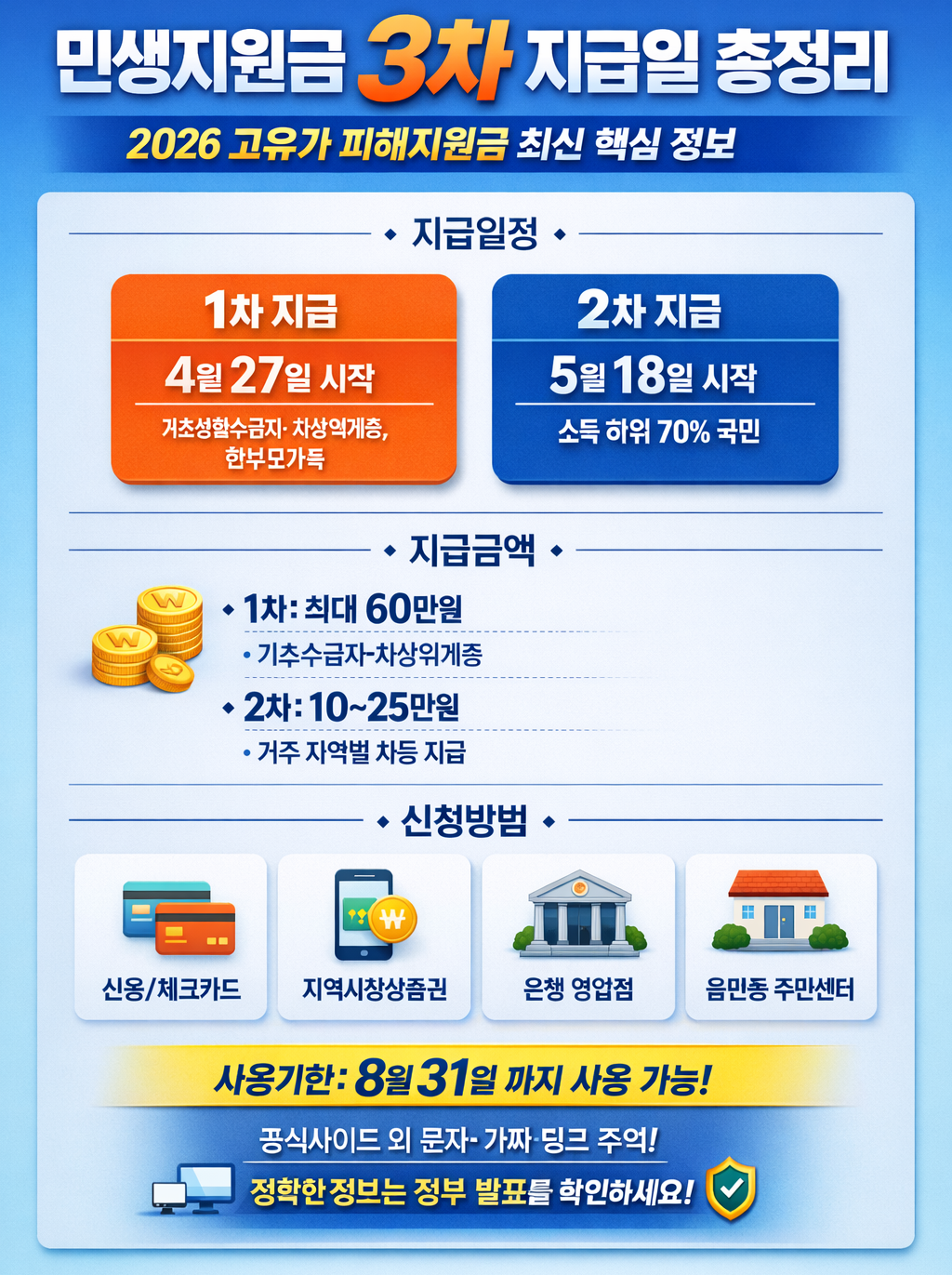 신청 시간도 꼭 알아둘 필요가 있습니다. 공식 안내 기준으로 온라인 신청은 신청 기간 동안 24시간 가능하고, 오프라인 신청은 평일 오전 9시부터 오후 6시까지, 은행 영업점은 오후 4시까지 운영됩니다. 다만 신청 첫 주에는 혼잡을 막기 위해 출생연도 끝자리 요일제가 적용됩니다. 월요일은 1과 6, 화요일은 2와 7, 수요일은 3과 8, 목요일은 4와 9, 금요일은 5와 0이 신청할 수 있습니다. 이번 1차 지급 기간에는 5월 1일이 공휴일이라 4월 30일에는 4·9뿐 아니라 5·0도 함께 신청 가능하도록 조정됐다는 점도 새로 나온 실무 정보입니다. 사용 기한도 확정됐습니다. 1차와 2차로 지급된 지원금은 모두 8월 31일 24시까지 사용해야 합니다. 사용처는 주소지 관할 지방정부 기준으로 운영되는 범위 안에서 적용되며, 카드로 신청한 경우에는 신청 다음 날 충전되고, 지역사랑상품권 역시 신청 다음 날 지급되는 방식으로 안내됐습니다. 빠르게 지급받을 수 있다는 점은 장점이지만, 사용 기한이 명확하므로 받기만 하고 보관하면 소멸될 수 있다는 점은 꼭 기억해야 합니다. 정리하면 지금 가장 중요한 핵심은 세 가지입니다. 첫째, 공식 명칭은 민생지원금 3차가 아니라 고유가 피해지원금입니다. 둘째, 지급은 4월 27일 1차, 5월 18일 2차로 시작됩니다. 셋째, 신청 장소는 카드사 앱·홈페이지, 지역사랑상품권 앱, 은행 영업점, 읍면동 주민센터로 나뉘며, 본인 상황에 맞는 방식을 선택해야 합니다. 이런 지원금은 항상 가짜 신청 링크나 문자 피싱이 따라붙기 때문에, 실제 확인은 정책브리핑과 정부 공식 발표 기준으로 하는 것이 가장 안전합니다.