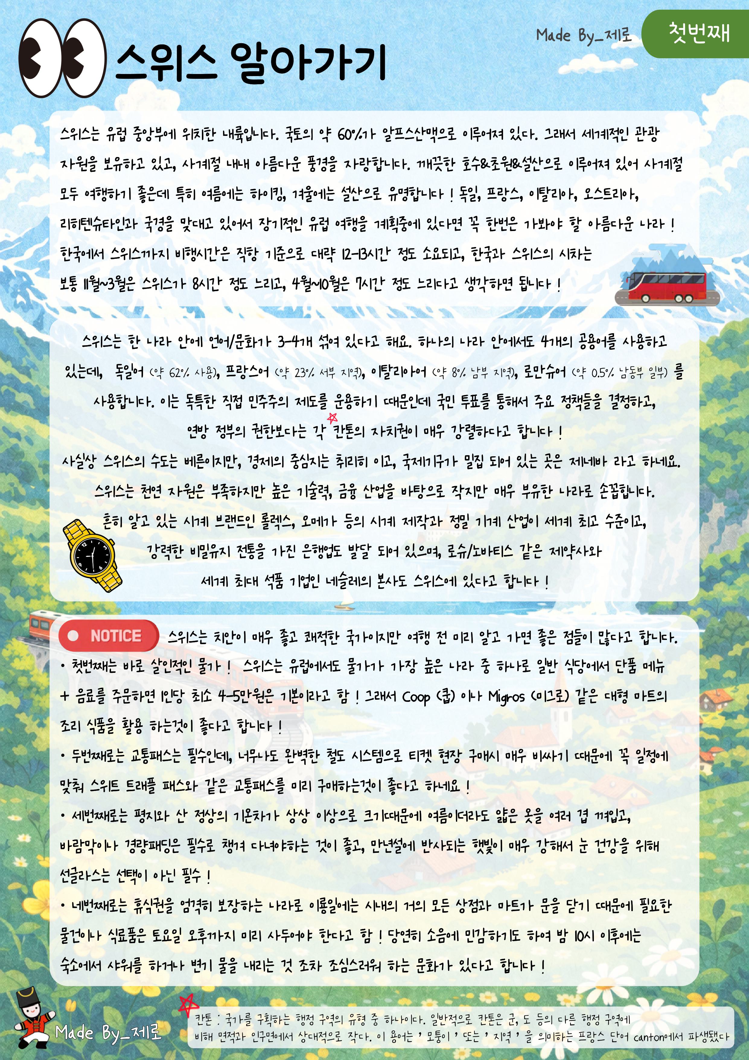 스위스는 유럽 중앙부에 있는 내륙국가로, 국토의 약 60퍼센트가 알프스 산맥으로 이루어져 있어 어디를 가도 풍경이 정말 인상적인 나라입니다. 독일, 프랑스, 이탈리아, 오스트리아, 리히텐슈타인과 국경을 맞대고 있어서 한 나라 안에서도 분위기가 꽤 다양하게 느껴지는 편입니다. 한국에서 스위스까지는 직항 기준으로 보통 12시간에서 13시간 정도 걸리고, 시차는 계절에 따라 다르지만 대체로 한국보다 7시간에서 8시간 느리다고 생각하면 일정 짜기 편합니다. 스위스는 독일어, 프랑스어, 이탈리아어, 로만슈어까지 공용어가 여러 개라 도시마다 분위기가 달라지는 것도 여행의 재미입니다. 수도는 베른이지만 경제와 교통의 중심은 취리히, 국제기구 이미지가 강한 곳은 제네바라고 생각하면 이해가 쉽습니다. 다만 스위스 여행에서 가장 먼저 체감하는 건 물가입니다. 식당 한 끼도 꽤 비싼 편이라 여행 경비를 아끼고 싶다면 Coop이나 Migros 같은 대형 마트를 잘 활용하는 것이 정말 중요합니다. 또 스위스는 기차 시스템이 워낙 잘 되어 있어서 이동이 많은 일정이라면 스위스 트래블 패스 같은 교통패스를 미리 따져보는 게 좋습니다. 여름이라도 산 위로 올라가면 기온 차가 크기 때문에 얇은 옷만 챙기기보다 겉옷을 꼭 준비해야 하고, 햇빛 반사가 강해서 선글라스도 의외로 유용합니다. 여기에 일요일에는 상점 문을 닫는 경우가 많고, 밤에는 조용한 문화를 중요하게 여기는 분위기가 있어 숙소에서도 너무 늦은 시간에는 소음을 줄이는 편이 좋습니다. 이런 기본만 알고 가도 스위스는 훨씬 편하고 만족스럽게 즐길 수 있는 나라입니다.