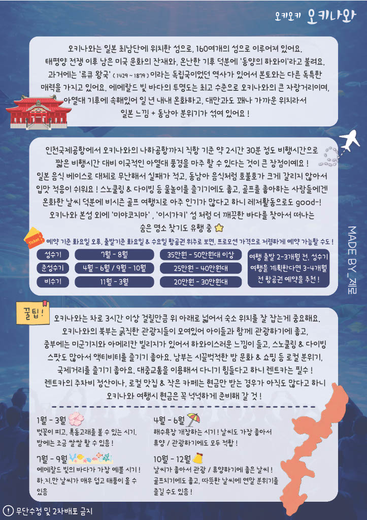 오키나와는 일본 최남단에 있는 섬 지역으로, 160여 개의 섬으로 이루어진 곳입니다. 그래서 같은 일본이라도 도쿄나 오사카와는 분위기가 꽤 다르게 느껴집니다. 바다 색감부터 공기, 거리의 분위기, 음식까지 전체적으로 더 따뜻하고 여유로운 느낌이 강하고, 일본 특유의 정돈된 감성과 동남아 같은 휴양지 분위기가 자연스럽게 섞여 있어서 처음 가도 금방 여행 기분이 살아나는 곳입니다. 예전 류큐 왕국의 역사도 남아 있어 단순히 바다만 예쁜 휴양지가 아니라 문화적으로도 매력이 분명합니다. 인천국제공항에서 나하공항까지 비행시간이 약 2시간 30분 정도라 멀게 느껴지지 않는 것도 큰 장점입니다. 짧은 비행으로 이국적인 풍경을 만날 수 있어서 가족여행, 커플여행, 친구끼리 떠나는 자유여행지로 꾸준히 인기 있는 이유가 있습니다. 여행 준비를 할 때는 지역을 위아래로 나눠 생각하면 훨씬 편합니다. 북부는 츄라우미수족관처럼 대표 관광지가 많아 아이와 함께 움직이기 좋고, 중부는 아메리칸빌리지처럼 쇼핑과 바다, 카페 감성이 섞여 있어 가볍게 둘러보기 좋습니다. 남부는 국제거리와 시장, 로컬 분위기를 느끼기에 잘 맞는 편입니다. 항공권은 자료 기준으로 7월에서 8월 성수기에는 35만 원에서 50만 원 이상, 4월에서 6월과 9월에서 10월 준성수기에는 25만 원에서 40만 원대, 11월에서 3월 비수기에는 20만 원에서 30만 원대까지 생각하면 일정 잡기에 도움이 됩니다. 다만 오키나와는 생각보다 차로 이동하는 시간이 긴 편이라 숙소 위치를 일정에 맞춰 잡는 것이 중요하고, 렌터카를 이용한다면 주차와 이동 동선까지 함께 고려하는 것이 좋습니다.