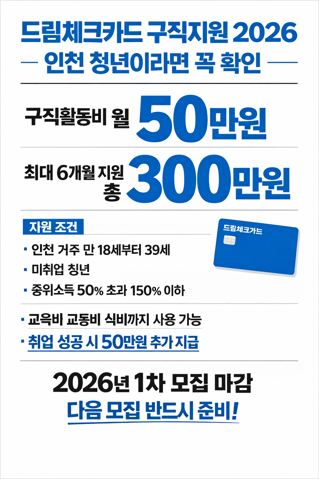 인천 드림체크카드는 단순한 지원금이 아니라, 취업 준비를 하는 청년들에게 실질적인 생활과 준비 비용을 동시에 지원하는 매우 현실적인 제도입니다. 특히 요즘처럼 물가가 계속 오르고 있는 상황에서는 구직활동 자체가 부담이 되는 경우가 많기 때문에, 이 제도의 체감 효과는 상당히 큰 편입니다.