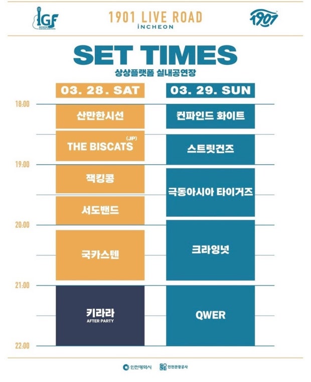 공연을 보려면 미리 가서 줄 서있어야 돼요 한번 들어가면 재입장 불가능이고 음식물 반입 금지이고 전문적인 촬영 금지입니다. 공연을 순서대로 하는데 앞팀들은 엄청 유명하지 않아서 그런지 3번 정도 들어갔다 나갔다 자유롭게 했는데 뒷팀부터는 유명해서 잘못하면 못 들어갈 수도 있어서 웬만하면 한번 들어가면 쭉! 있는 게 유리하고요. 앞에서 보고 싶으면 일찍 가서 줄 서는 방법밖에 없습니다. 무료 공연이다 보니깐 선착순이라서요. 저희도 사실 국카스텐 때문에 갔는데 정작 7시 30분에 다시 들어가려고 줄을 다시 섰더니 정말 까딱하면 못 들어갈 뻔했습니다.. 1200 명한 정이라서 나오는 만큼 들어갈 수 있다고 하니 정말 보고 싶은 팀이 있으면 그냥 웬만하면 만반의 준비를 하시고 가셔서 나오지 마세요ㅋㅋ 그리고 안에 통풍이 안돼서 생각보다 많이 덥습니다. 저희는 쪄죽을뻔했어요. 다행히 안에 반팔을 입고 가서 벗었지만 그래도 웬만한 찜질방 저리 가라 에여. 분위기랑 열기 때문에 다들 땀 범벅입니다. 2026. 03. 29 일요일