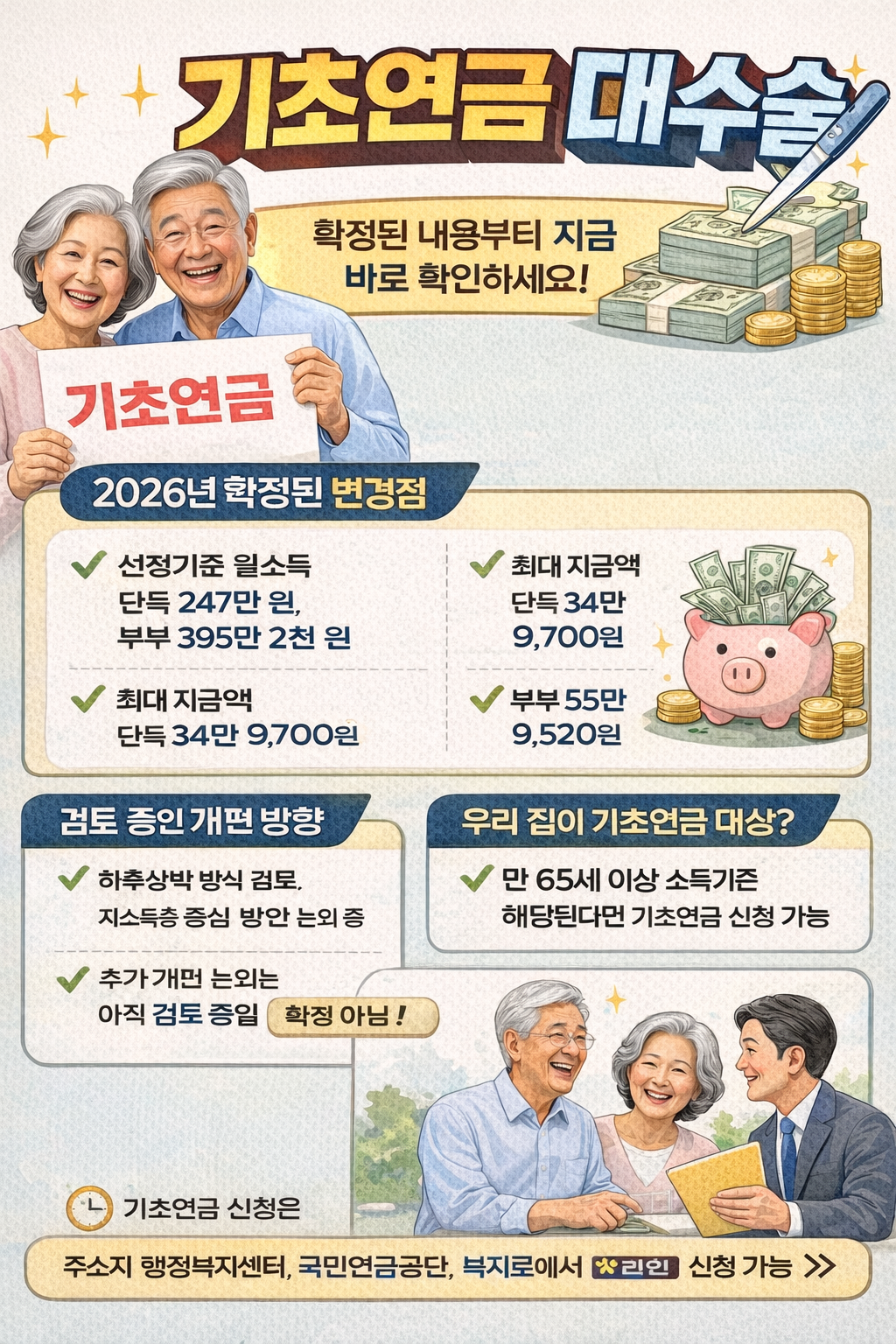 요즘 말하는 기초연금 대수술은 이미 하나의 확정 개편안이 끝났다는 뜻이라기보다, 2026년에 실제로 바뀐 내용과 앞으로 검토 중인 추가 개편 논의가 함께 섞여 나온 표현에 가깝습니다. 현재 확정된 사실부터 보면, 2026년 기초연금 선정기준액은 단독가구 월 247만 원, 부부가구 월 395만 2천 원으로 올라갔고, 기준연금액도 전년도 소비자물가상승률 2.1%를 반영해 단독가구 기준 최대 월 34만 9,700원, 부부 2인 가구 기준 최대 월 55만 9,520원까지 지급되는 구조입니다. 즉 지금 당장 가장 중요한 변화는 이미 수급 문턱과 월 지급액이 올라가 있다는 점입니다. 정부가 이런 조정을 한 이유도 분명합니다. 보건복지부는 2026년 선정기준액 발표에서 노인 가구의 소득과 재산 수준이 높아지고 있어 제도의 지속가능성과 노후소득보장을 함께 고려한 제도 개선 논의가 필요하다고 설명했습니다. 쉽게 말하면 예전 방식대로 계속 운영하면 수급 범위와 재정 구조를 다시 손봐야 할 시점이 왔다는 의미입니다. 그래서 최근 기사나 방송에서 기초연금 대수술이라는 표현이 많이 보이지만, 지금 단계에서는 이미 확정된 부분과 앞으로 논의될 부분을 구분해서 보는 것이 가장 중요합니다. 또 하나 꼭 알아둘 점은 기초연금은 만 65세 이상이면서 소득인정액이 선정기준액 이하인 어르신이 대상이라는 기본 틀은 그대로 유지되고 있다는 것입니다. 2026년 기준으로는 단독가구 247만 원 이하, 부부가구 395만 2천 원 이하가 기준이고, 공무원연금이나 사학연금 같은 직역연금 수급권자와 그 배우자는 일부 제외될 수 있습니다. 그래서 대수술이라는 표현만 보고 제도가 완전히 뒤집혔다고 생각하기보다, 현재는 기본 틀은 유지하면서 수급기준과 급여, 그리고 추가 개편 방향이 조정되는 과정이라고 이해하는 편이 맞습니다.